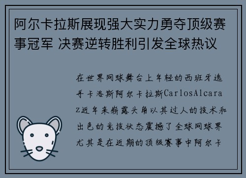 在世界网球舞台上,年轻的西班牙选手卡洛斯·阿尔卡拉斯(Carlos Alcaraz)近年来崭露头角,以其过人的技术和出色的竞技状态震撼了全球网球界。尤其是在近期的顶级赛事中,阿尔卡拉斯凭借强大的实力和...
