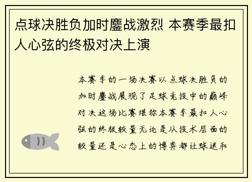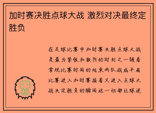 在足球比赛中,加时赛决胜点球大战是最为紧张和激烈的时刻之一。随着常规比赛时间的结束,两队战成平局,比赛进入加时赛,接着又进入点球大战,决定胜负的瞬间,这一切都让球迷和球员们都保持着极高的关注度。加时赛...