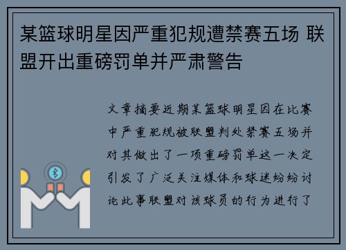 文章摘要:近期,某篮球明星因在比赛中严重犯规,被联盟判处禁赛五场,并对其做出了一项重磅罚单。这一决定引发了广泛关注,媒体和球迷纷纷讨论此事。联盟对该球员的行为进行了严肃警告,并表明了未来将加大对不当行...