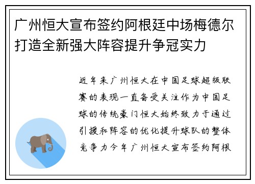 近年来,广州恒大在中国足球超级联赛的表现一直备受关注,作为中国足球的传统豪门,恒大始终致力于通过引援和阵容的优化,提升球队的整体竞争力。今年,广州恒大宣布签约阿根廷中场梅德尔,标志着俱乐部在构建全新强...