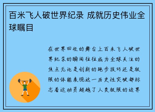 在世界田径的舞台上,百米飞人破世界纪录的瞬间,往往成为全球关注的焦点。无论是创新的跑步技巧,还是极限的体能表现,这一历史性突破都标志着运动员超越了人类极限的边界,也象征着体育精神的至高追求。本文将从四...