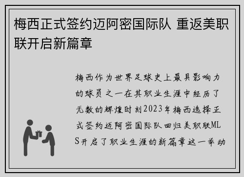 梅西,作为世界足球史上最具影响力的球员之一,在其职业生涯中经历了无数的辉煌时刻。2023年,梅西选择正式签约迈阿密国际队,回归美职联(MLS),开启了职业生涯的新篇章。这一举动不仅令全球足球迷为之振奋...