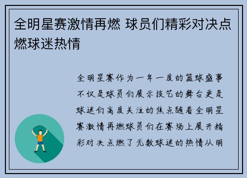 全明星赛作为一年一度的篮球盛事,不仅是球员们展示技艺的舞台,更是球迷们高度关注的焦点。随着全明星赛激情再燃,球员们在赛场上展开精彩对决,点燃了无数球迷的热情。从明星球员的个人表现,到精彩的团队协作,再...