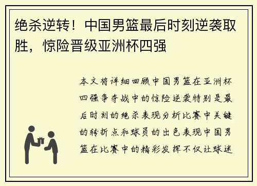 本文将详细回顾中国男篮在亚洲杯四强争夺战中的惊险逆袭,特别是最后时刻的绝杀表现,分析比赛中关键的转折点和球员的出色表现。中国男篮在比赛中的精彩发挥不仅让球迷感到振奋,也展现了团队的坚韧与不屈。通过分析...