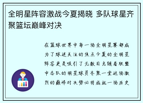 在篮球世界中,每一场全明星赛都成为了球迷关注的焦点,今夏的全明星阵容更是吸引了无数目光。随着联盟中各队的明星球员齐聚一堂,这场激烈的巅峰对决势必将成就一场历史性的对抗。这篇文章将从四个方面来详细探讨2...