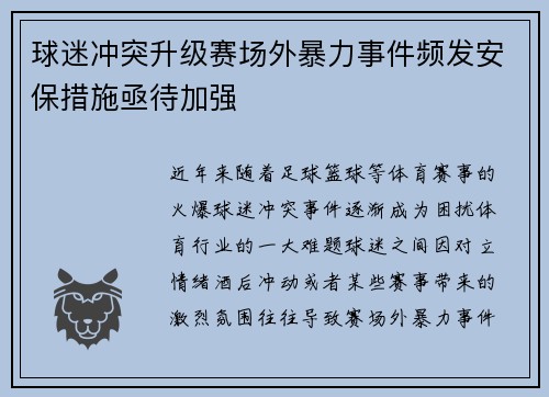 近年来,随着足球、篮球等体育赛事的火爆,球迷冲突事件逐渐成为困扰体育行业的一大难题。球迷之间因对立情绪、酒后冲动或者某些赛事带来的激烈氛围,往往导致赛场外暴力事件的频发。尤其在球迷群体庞大的情况下,暴...