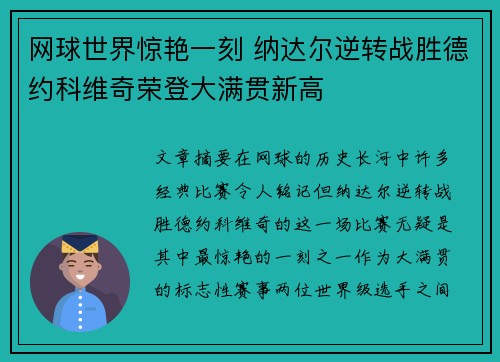 文章摘要:在网球的历史长河中,许多经典比赛令人铭记,但纳达尔逆转战胜德约科维奇的这一场比赛无疑是其中最惊艳的一刻之一。作为大满贯的标志性赛事,两位世界级选手之间的对决不仅充满了技术上的较量,更是在心理...