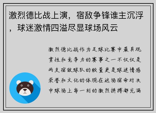 激烈德比战,作为足球比赛中最具观赏性和竞争力的赛事之一,不仅仅是两支宿敌球队的较量,更是球迷情感、荣誉和文化的体现。在这场宿命对决中,球场上每一刻的激烈拼搏都充满了悬念和戏剧性。球员们在场上的每一脚传...