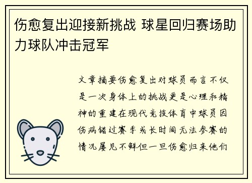 文章摘要:伤愈复出对球员而言,不仅是一次身体上的挑战,更是心理和精神的重建。在现代竞技体育中,球员因伤病错过赛季或长时间无法参赛的情况屡见不鲜,但一旦伤愈归来,他们的回归往往会成为球队的一个重大转折点...