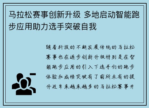 随着科技的不断发展,传统的马拉松赛事也在逐步创新升级,特别是在智能跑步应用的引入下,选手们的跑步体验和成绩突破有了前所未有的提升。近年来,越来越多的马拉松赛事开始借助智能跑步技术,为选手提供个性化的训...