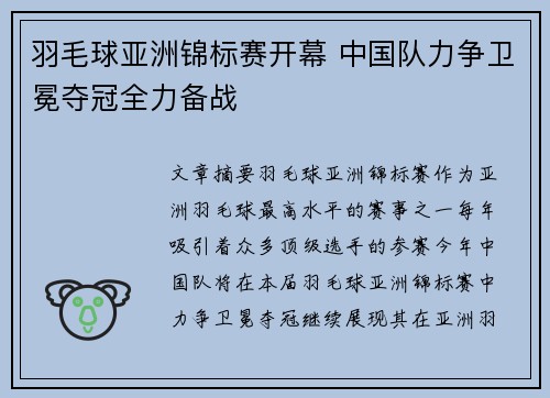 文章摘要:羽毛球亚洲锦标赛作为亚洲羽毛球最高水平的赛事之一,每年吸引着众多顶级选手的参赛。今年,中国队将在本届羽毛球亚洲锦标赛中力争卫冕夺冠,继续展现其在亚洲羽毛球赛场上的强大实力。文章将从四个方面详...