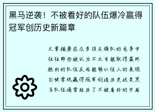 文章摘要:在众多顶尖强队的竞争中,往往那些被认为不太可能取得最终胜利的队伍,反而能够以惊人的表现打破常规,赢得冠军,创造历史。这类“黑马”队伍通常经历了不被看好的开局,却凭借独特的战术、强大的团队精神...