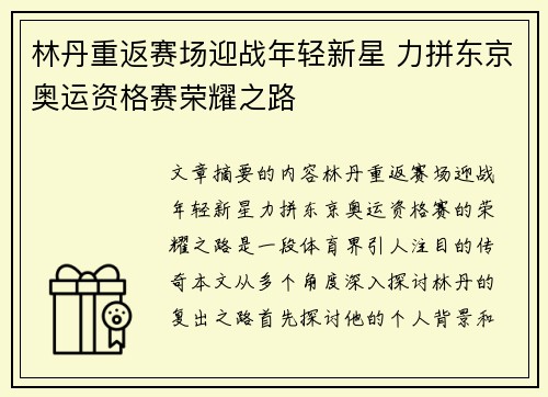 文章摘要的内容林丹重返赛场,迎战年轻新星,力拼东京奥运资格赛的荣耀之路,是一段体育界引人注目的传奇。本文从多个角度深入探讨林丹的复出之路:首先,探讨他的个人背景和职业生涯的辉煌;其次,分析他面对年轻对...