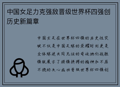中国女足在世界杯四强的历史性突破,不仅是中国足球的荣耀时刻,更是全体球迷共同见证的奇迹。她们战胜强敌,展示了顽强拼搏的精神和不屈不挠的决心,成功晋级世界杯四强,创下了历史新篇章。这一成就背后凝聚了无数...