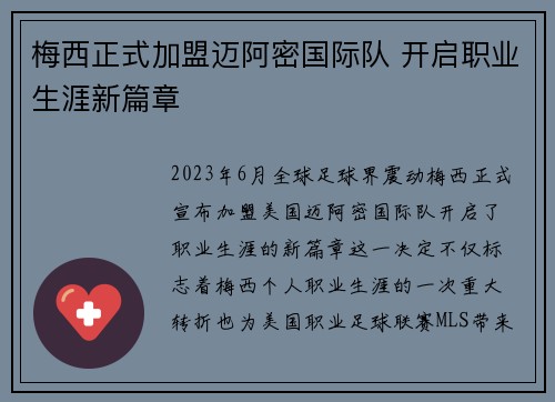 2023年6月,全球足球界震动,梅西正式宣布加盟美国迈阿密国际队,开启了职业生涯的新篇章。这一决定不仅标志着梅西个人职业生涯的一次重大转折,也为美国职业足球联赛(MLS)带来了前所未有的关注与期待。在...