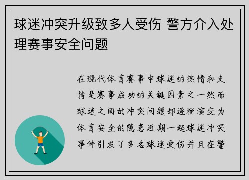 在现代体育赛事中,球迷的热情和支持是赛事成功的关键因素之一。然而,球迷之间的冲突问题却逐渐演变为体育安全的隐患。近期,一起球迷冲突事件引发了多名球迷受伤,并且在警方的介入下才得以平息。这一事件不仅揭示...