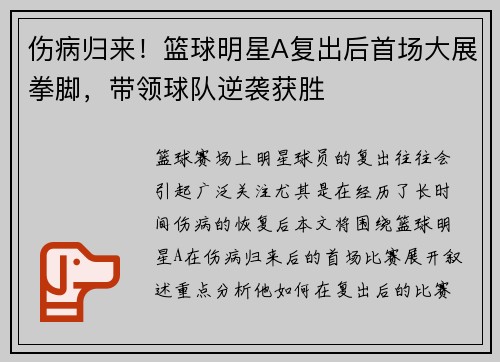 篮球赛场上,明星球员的复出往往会引起广泛关注,尤其是在经历了长时间伤病的恢复后。本文将围绕篮球明星A在伤病归来后的首场比赛展开叙述,重点分析他如何在复出后的比赛中大展拳脚,带领球队完成逆袭并最终获得胜...