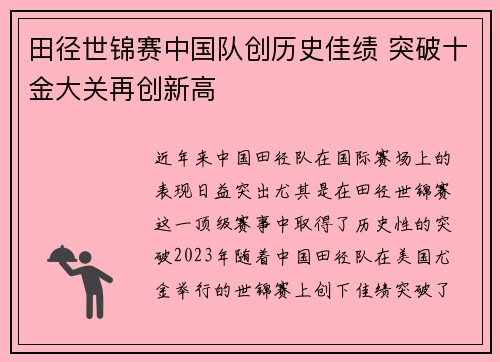 近年来,中国田径队在国际赛场上的表现日益突出,尤其是在田径世锦赛这一顶级赛事中取得了历史性的突破。2023年,随着中国田径队在美国尤金举行的世锦赛上创下佳绩,突破了十金大关,再创新高,成为了备受瞩目的...