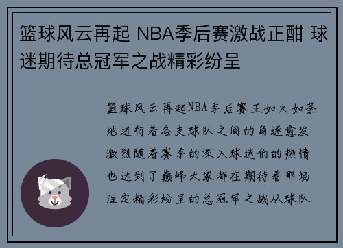 • 篮球风云再起 NBA季后赛激战正酣 球迷期待总冠军之战精彩纷呈