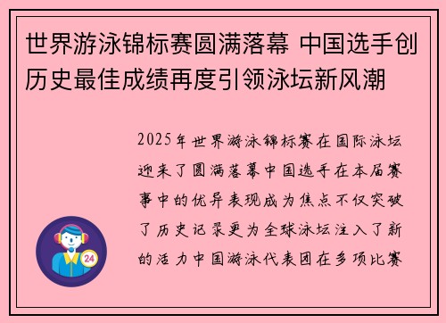 • 世界游泳锦标赛圆满落幕 中国选手创历史最佳成绩再度引领泳坛新风潮