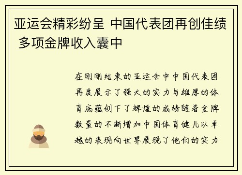 • 亚运会精彩纷呈 中国代表团再创佳绩 多项金牌收入囊中