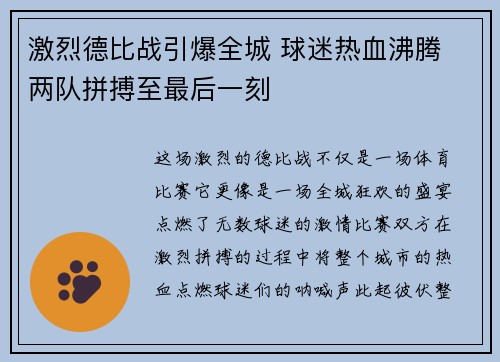 这场激烈的德比战不仅是一场体育比赛,它更像是一场全城狂欢的盛宴,点燃了无数球迷的激情。比赛双方在激烈拼搏的过程中,将整个城市的热血点燃,球迷们的呐喊声此起彼伏,整个城市仿佛沉浸在一种超越平常的竞技氛围...