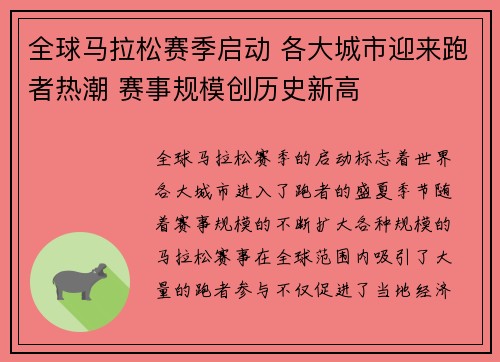 全球马拉松赛季的启动,标志着世界各大城市进入了跑者的盛夏季节。随着赛事规模的不断扩大,各种规模的马拉松赛事在全球范围内吸引了大量的跑者参与,不仅促进了当地经济,也为全民健身运动注入了新的活力。2025...