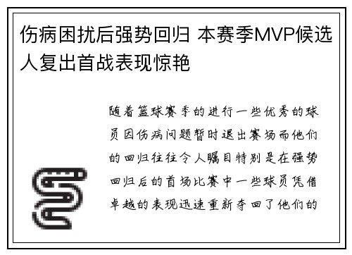 随着篮球赛季的进行,一些优秀的球员因伤病问题暂时退出赛场,而他们的回归往往令人瞩目。特别是在强势回归后的首场比赛中,一些球员凭借卓越的表现,迅速重新夺回了他们的地位。今年,本赛季MVP候选人之一的球员...