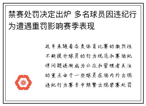 近年来,随着各类体育比赛的激烈性不断提升,球员的行为规范和赛场纪律问题逐渐成为公众和管理者关注的重点。由于一些球员在场内外出现违纪行为,赛季中频繁出现禁赛处罚的情况。这些禁赛处罚不仅会对球员个人造成巨...