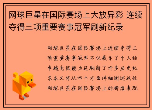 网球巨星在国际赛场上连续夺得三项重要赛事冠军,不仅展示了个人的卓越竞技能力,还刷新了许多历史纪录。本文将从四个方面详细阐述这位网球巨星在国际赛场上的辉煌表现。首先,文章将探讨他在技术上的不断进步,如何...