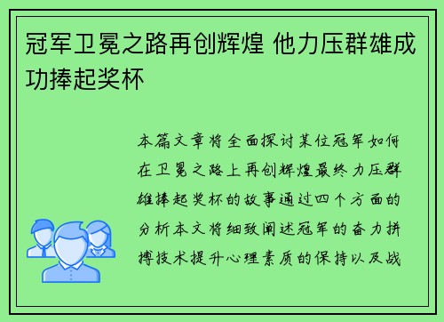 本篇文章将全面探讨某位冠军如何在卫冕之路上再创辉煌,最终力压群雄捧起奖杯的故事。通过四个方面的分析,本文将细致阐述冠军的奋力拼搏、技术提升、心理素质的保持,以及战术调整等方面如何帮助他成功卫冕并实现新...