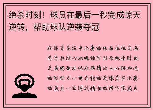 在体育竞技中,比赛的结局往往充满悬念和惊心动魄的时刻,而“绝杀时刻”是最能激发观众热情、让人心跳加速的时刻之一。绝杀,指的是球员在比赛的最后一刻,通过精准的操作完成关键进球,帮助球队逆袭成功。尤其是在...