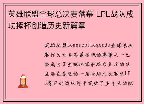 英雄联盟(League of Legends)全球总决赛作为电竞界最顶级的赛事之一,已经成为了全球玩家和观众关注的焦点。而在最近的一届全球总决赛中,LPL赛区的战队终于突破了多年来的瓶颈,成功捧起了冠...