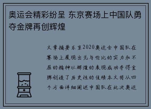 文章摘要:东京2020奥运会,中国队在赛场上展现出无与伦比的实力和不屈的精神,以辉煌的表现成功夺得金牌,创造了历史性的佳绩。本文将从四个方面详细阐述中国队在此次奥运会上如何表现出色,如何在东京赛场上奋...