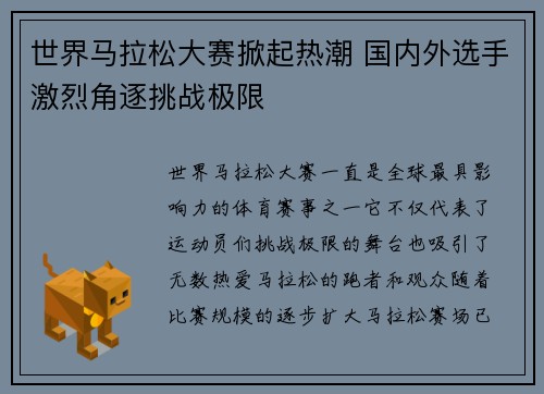 世界马拉松大赛一直是全球最具影响力的体育赛事之一,它不仅代表了运动员们挑战极限的舞台,也吸引了无数热爱马拉松的跑者和观众。随着比赛规模的逐步扩大,马拉松赛场已不再是单纯的竞技场,而是成为了全球跑者们展...