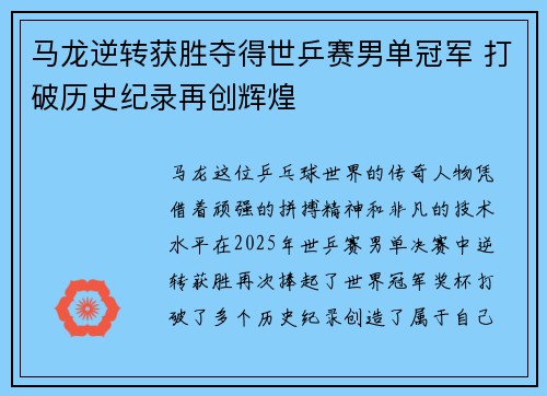 马龙,这位乒乓球世界的传奇人物,凭借着顽强的拼搏精神和非凡的技术水平,在2025年世乒赛男单决赛中逆转获胜,再次捧起了世界冠军奖杯,打破了多个历史纪录,创造了属于自己的辉煌篇章。此次冠军不仅仅意味着马...