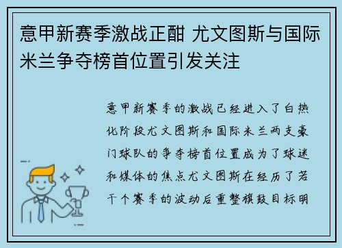 意甲新赛季的激战已经进入了白热化阶段,尤文图斯和国际米兰两支豪门球队的争夺榜首位置成为了球迷和媒体的焦点。尤文图斯在经历了若干个赛季的波动后,重整旗鼓,目标明确:争夺冠军;而国际米兰则延续着其稳定的表...