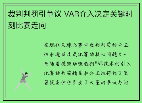 在现代足球比赛中,裁判判罚的公正性和透明度是比赛的核心问题之一。而随着视频助理裁判(VAR)技术的引入,比赛的判罚精度和公正性得到了显著提高,但也引发了大量的争议与讨论。VAR的出现使得许多曾经被忽视...