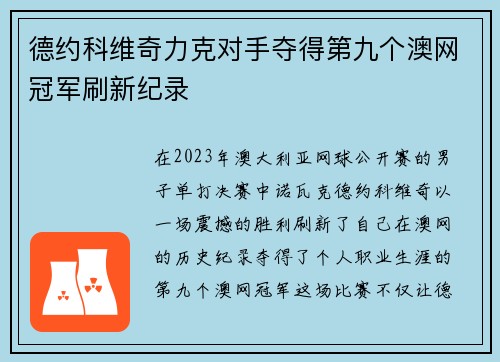在2023年澳大利亚网球公开赛的男子单打决赛中,诺瓦克·德约科维奇以一场震撼的胜利刷新了自己在澳网的历史纪录,夺得了个人职业生涯的第九个澳网冠军。这场比赛不仅让德约科维奇巩固了自己作为网坛传奇的地位,...