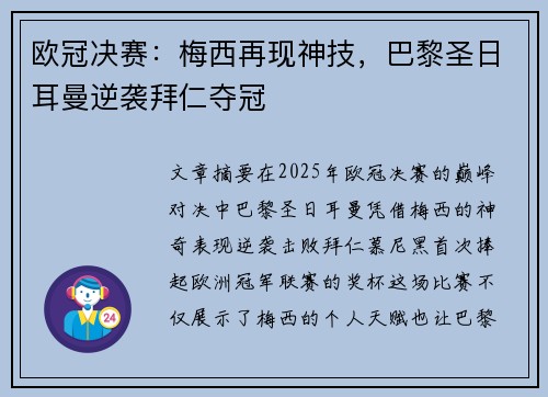 文章摘要:在2025年欧冠决赛的巅峰对决中,巴黎圣日耳曼凭借梅西的神奇表现,逆袭击败拜仁慕尼黑,首次捧起欧洲冠军联赛的奖杯。这场比赛不仅展示了梅西的个人天赋,也让巴黎圣日耳曼的团队协作得到了极大的肯定...