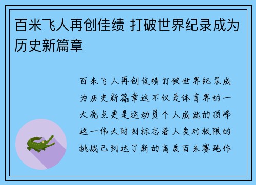 百米飞人再创佳绩,打破世界纪录,成为历史新篇章。这不仅是体育界的一大亮点,更是运动员个人成就的顶峰。这一伟大时刻,标志着人类对极限的挑战已到达了新的高度。百米赛跑作为速度与力量的完美结合,一直以来都是...