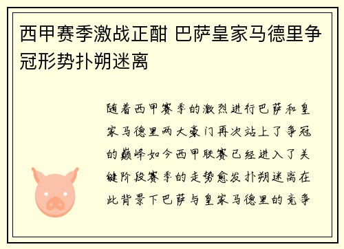 随着西甲赛季的激烈进行,巴萨和皇家马德里两大豪门再次站上了争冠的巅峰。如今,西甲联赛已经进入了关键阶段,赛季的走势愈发扑朔迷离。在此背景下,巴萨与皇家马德里的竞争格局,成为了全球球迷关注的焦点。两支球...
