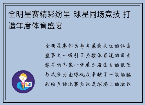 全明星赛作为每年最受关注的体育盛事之一,吸引了无数体育迷的目光。球星们齐聚一堂,展示着各自的技艺与风采,为全球观众奉献了一场场精彩纷呈的比赛。无论是球场上的激烈对抗,还是球迷们的热情互动,所有元素交织...
