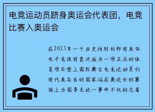 • 电竞运动员跻身奥运会代表团,电竞比赛入奥运会