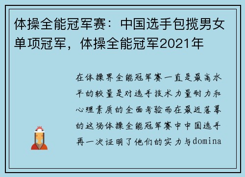 在体操界,全能冠军赛一直是最高水平的较量,是对选手技术、力量、耐力和心理素质的全面考验。而在最近落幕的这场体操全能冠军赛中,中国选手再一次证明了他们的实力与dominance。无论是男子项目还是女子项...