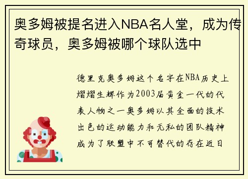 德里克·奥多姆,这个名字在NBA历史上熠熠生辉。作为2003届黄金一代的代表人物之一,奥多姆以其全面的技术、出色的运动能力和无私的团队精神,成为了联盟中不可替代的存在。近日,奥多姆正式被提名进入NBA...