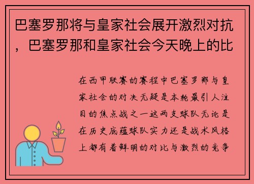 在西甲联赛的赛程中,巴塞罗那与皇家社会的对决无疑是本轮最引人注目的焦点战之一。这两支球队无论是在历史底蕴、球队实力还是战术风格上,都有着鲜明的对比与激烈的竞争。巴塞罗那作为西甲传统豪门,一直以来都是冠...