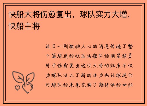 近日,一则激动人心的消息传遍了整个篮球迷的社区——快船队的明星球员终于伤愈复出!这位大将的归来不仅为球队注入了新的活力,也让球迷们对球队的未来充满了期待。他的回归不仅仅是个人职业生涯的重要时刻,更是整...