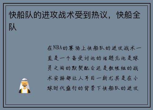 在NBA的赛场上,快船队的进攻战术一直是一个备受讨论的话题。无论是球员之间的默契配合,还是教练组的战术安排,都让人耳目一新。尤其是在“小球时代”盛行的背景下,快船队的进攻打法显得尤为独特。他们通过灵活...