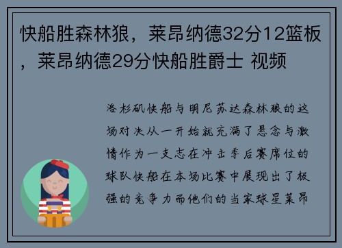 洛杉矶快船与明尼苏达森林狼的这场对决,从一开始就充满了悬念与激情。作为一支志在冲击季后赛席位的球队,快船在本场比赛中展现出了极强的竞争力,而他们的当家球星莱昂纳德更是用一场不可思议的表现证明了自己的价...
